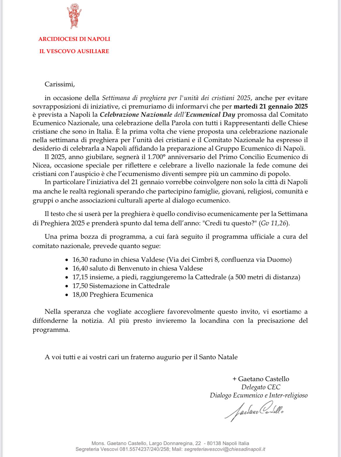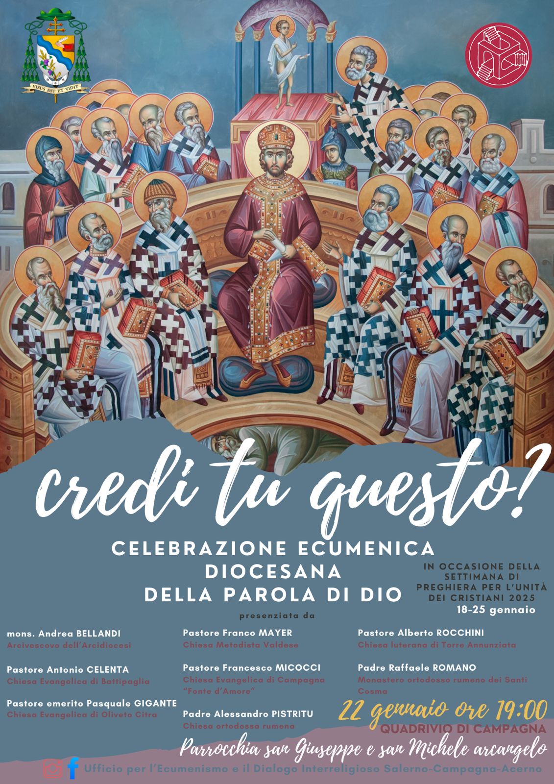 L’Ufficio diocesano per l’ecumenismo e il dialogo interreligioso invita, dunque, a partecipare a due appuntamenti importanti: martedì 21 gennaio a Napoli per l’Ecumenical Day, celebrazione nazionale che vedrà tutti i rappresentanti delle Chiese cristiane in Italia confluire nella Cattedrale di Napoli, e mercoledì 22 gennaio alle ore 19.00, presso la parrocchia di san Giuseppe e san Michele arcangelo al Quadrivio di Campagna. La partecipazione di S.E. Mons. Andrea Bellandi insieme ai rappresentanti delle diverse comunità cristiane del territorio è segno di speranza per i cristiani, che si riconoscono figli di “Dio, Padre onnipotente, Creatore del cielo e della terra” e compagni di quel “solo Signore, Gesù Cristo, Unigenito Figlio di Dio”.