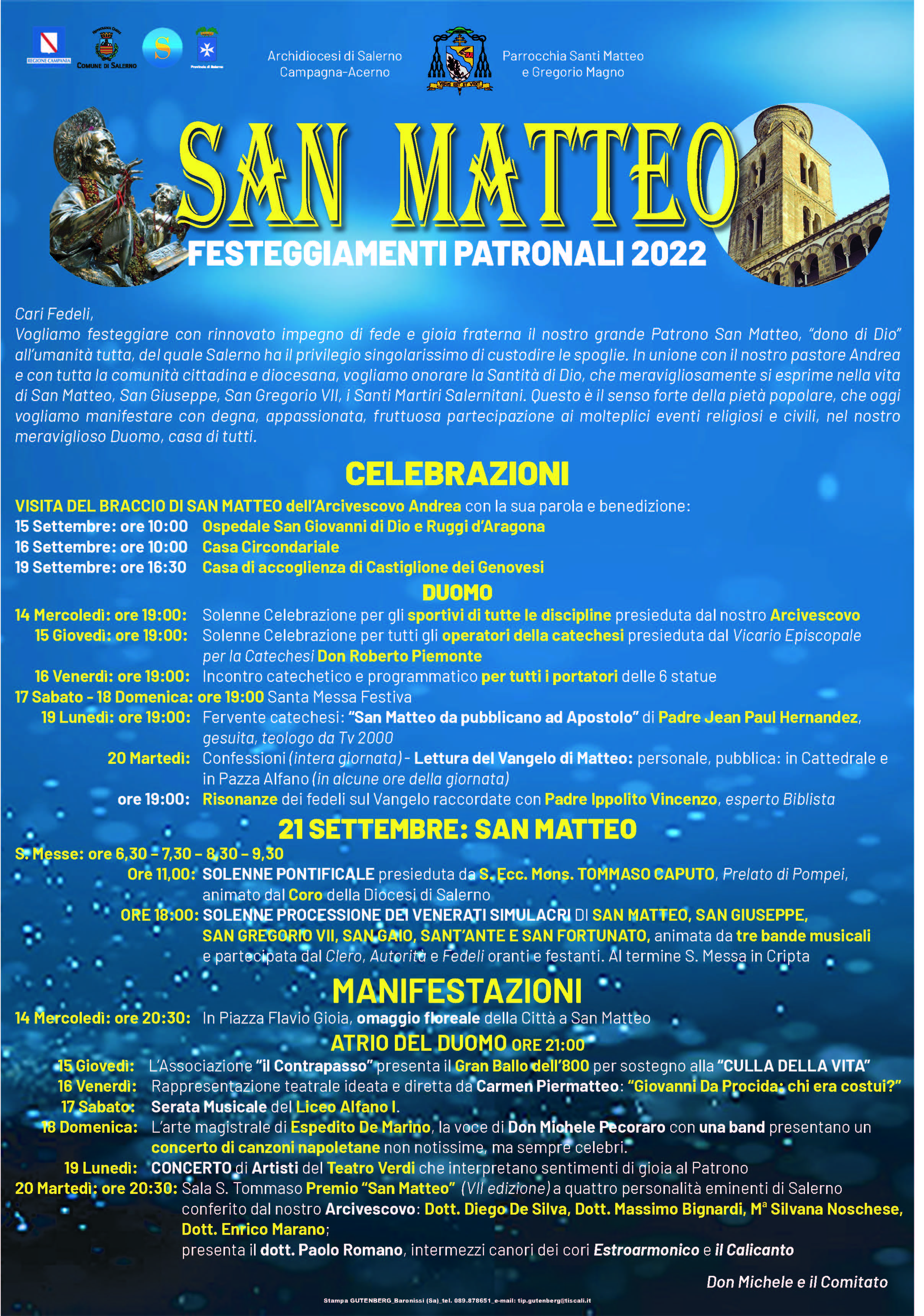 San Matteo Programma 2022 Sarà possibile seguire la diretta televisiva sul Canale 87 di TELE DIOCESI SALERNO o sul canale YouTube tds television.