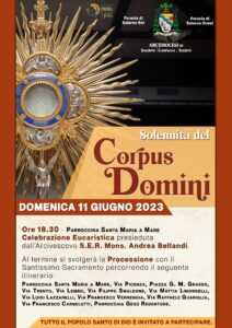 Domenica 11 giugno, solennità del Santissimo Corpo e Sangue di Cristo, l’Arcivescovo presiederà la Celebrazione Eucaristica alle ore 18.30 nella parrocchia Santa Maria a Mare. Seguirà la processione cittadina del Corpus Domini con il seguente itinerario: