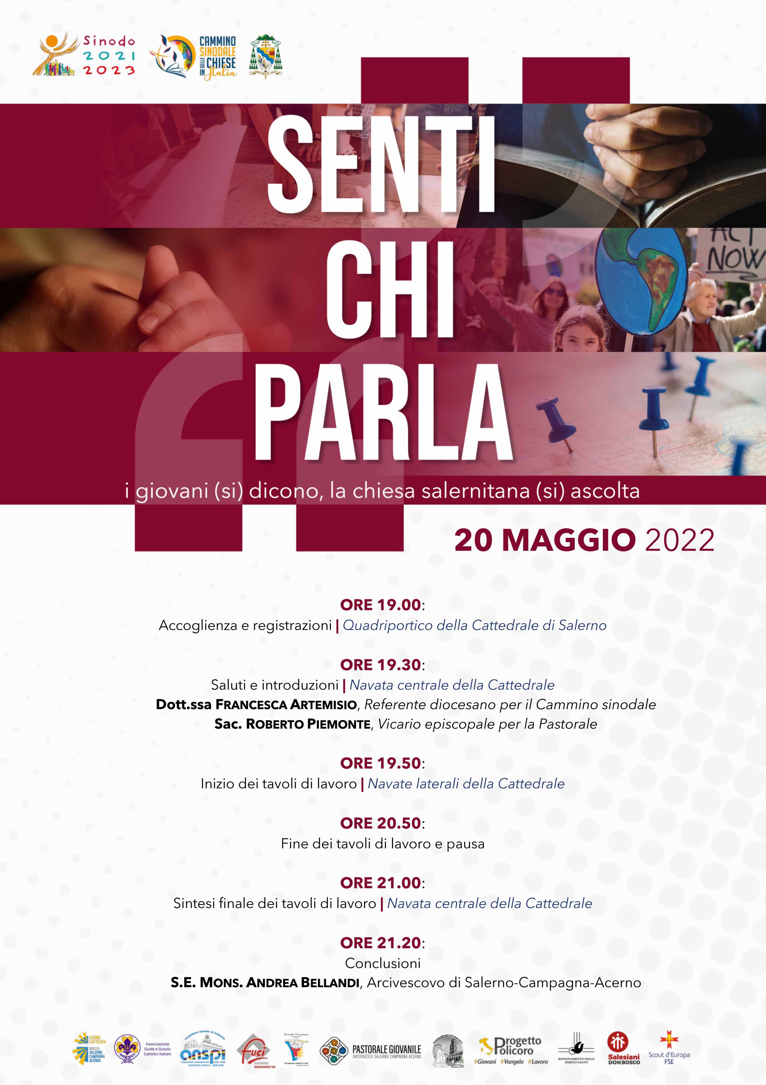 Venerdì 20 maggio alle 19:30, presso la Cattedrale di Salerno, si terrà un tavolo di consultazione sinodale dove circa 70 giovani della nostra Arcidiocesi si incontreranno e si confronteranno. Tema della serata Senti chi parla.
