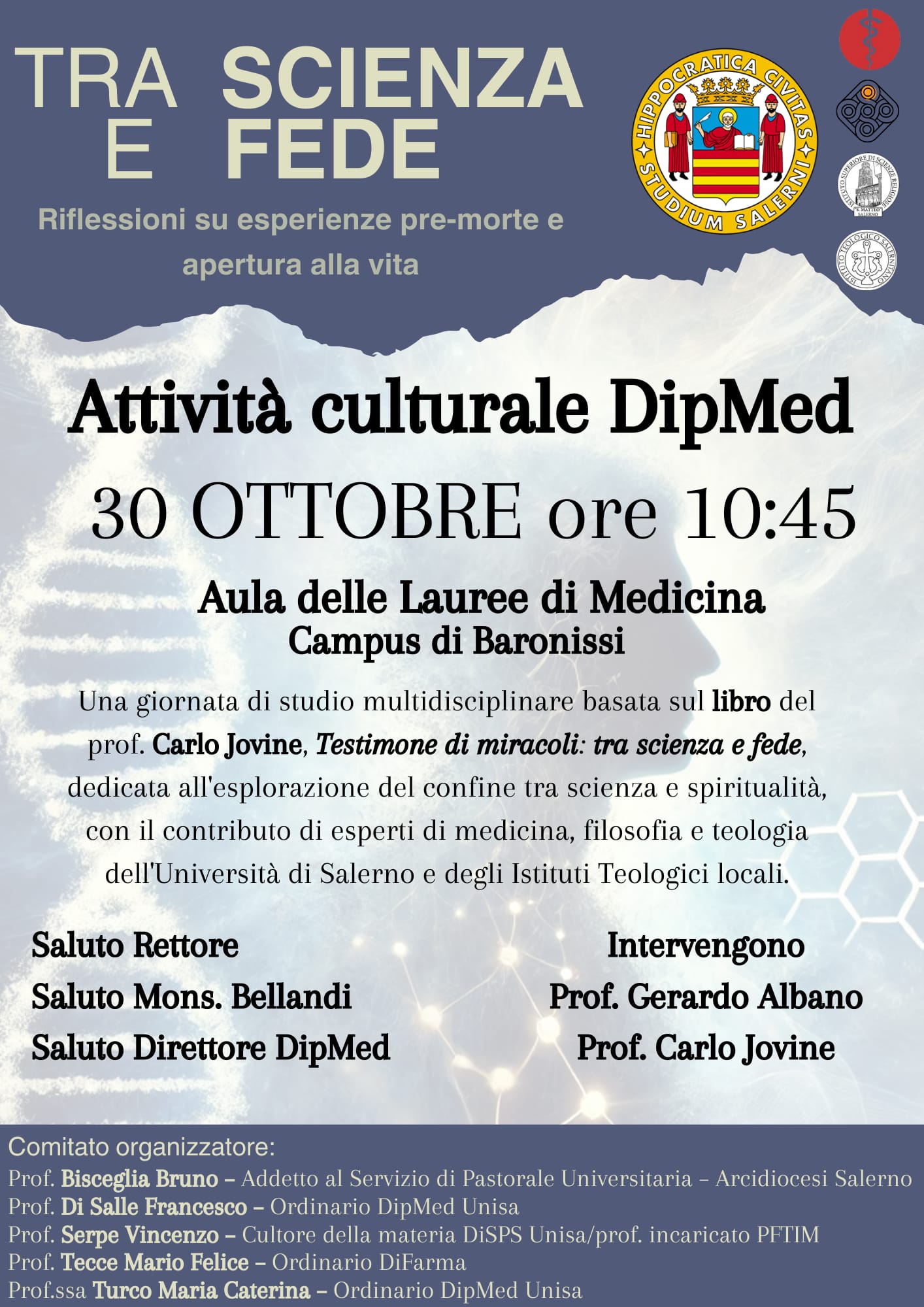 Mercoledì 30 ottobre, alle ore 10.45, presso l’aula delle Lauree di Medicina, Campus di Baronissi, si terrà un incontro che ha come titolo “Tra scienza e fede, riflessioni su esperienze pre-morte e apertura alla vita”. L’iniziativa vuole essere una giornata di studio partendo proprio dal testo del prof. Jovine, coinvolgendo alcuni docenti Unisa e degli Istituti Teologici presenti sul territorio Salernitano. Si propone quindi una iniziativa culturale ad ampio raggio che sia in grado di tenere insieme varie discipline scientifiche e umanistiche, in cui riflettere insieme su tali fenomeni e aprire prospettive di ricerca che hanno una interessante commistione tra medicina, filosofia e teologia.