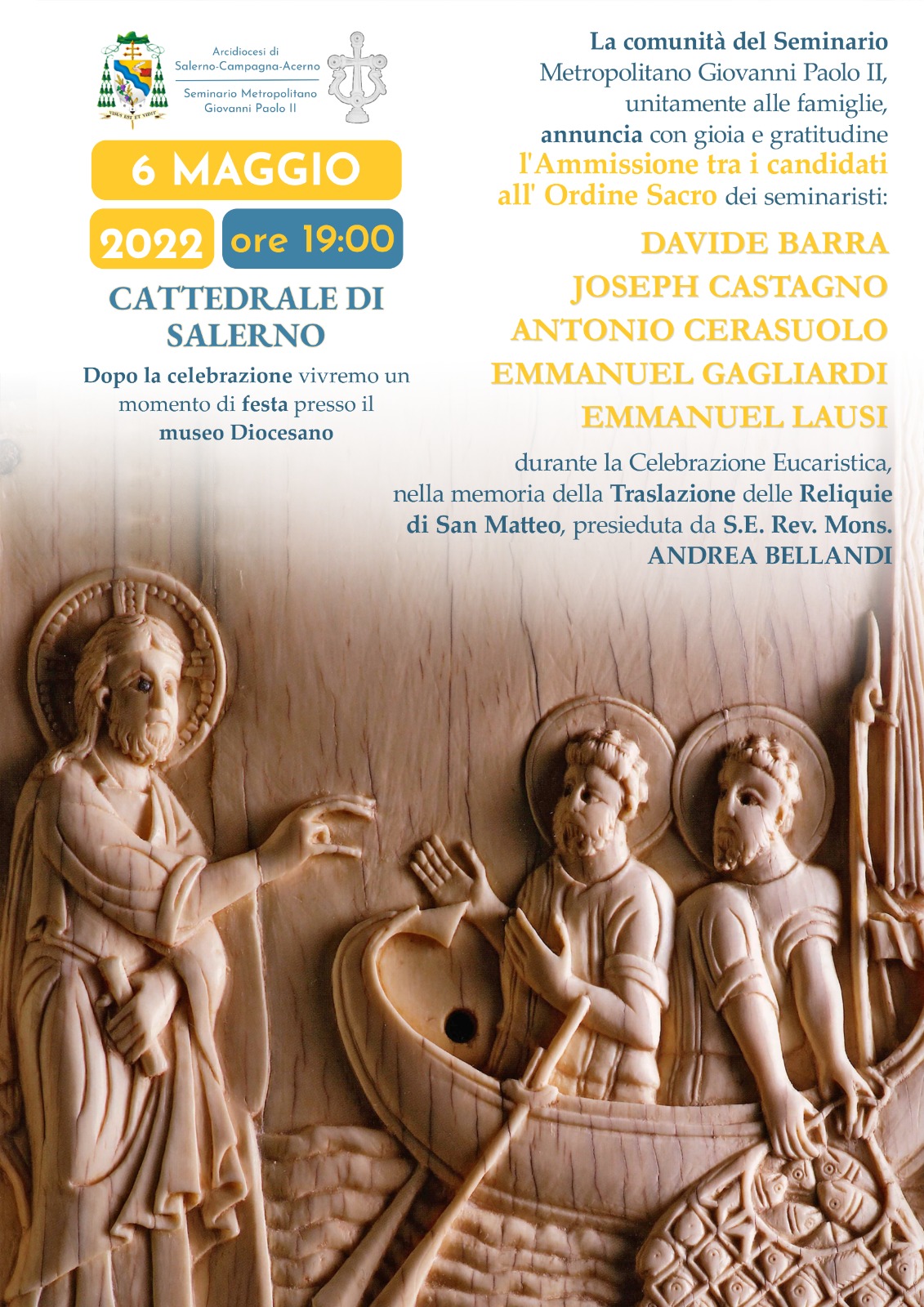 Per ricordare la traslazione delle reliquie di San Matteo avvenuta nel lontano 6 maggio 954, sono stati organizzati una serie di eventi che culminano con la giornata del 6 maggio quando si celebrerà il Solenne Pontificale e verranno ammessi agli ordini del diaconato e del presbiterato 5 seminaristi.