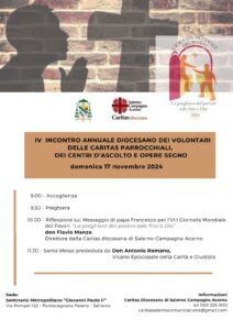 Domenica 16 novembre presso il Seminario Metropolitano di Pontecagnano Faiano, la Caritas Diocesana di Salerno-Campagna-Acerno, in comunione con il Santo Padre e con la Chiesa universale, invita sacerdoti, religiosi, volontari e fedeli a partecipare alla IX Giornata Mondiale dei Poveri. Nel corso dell’incontro verrà anche presentato il ...