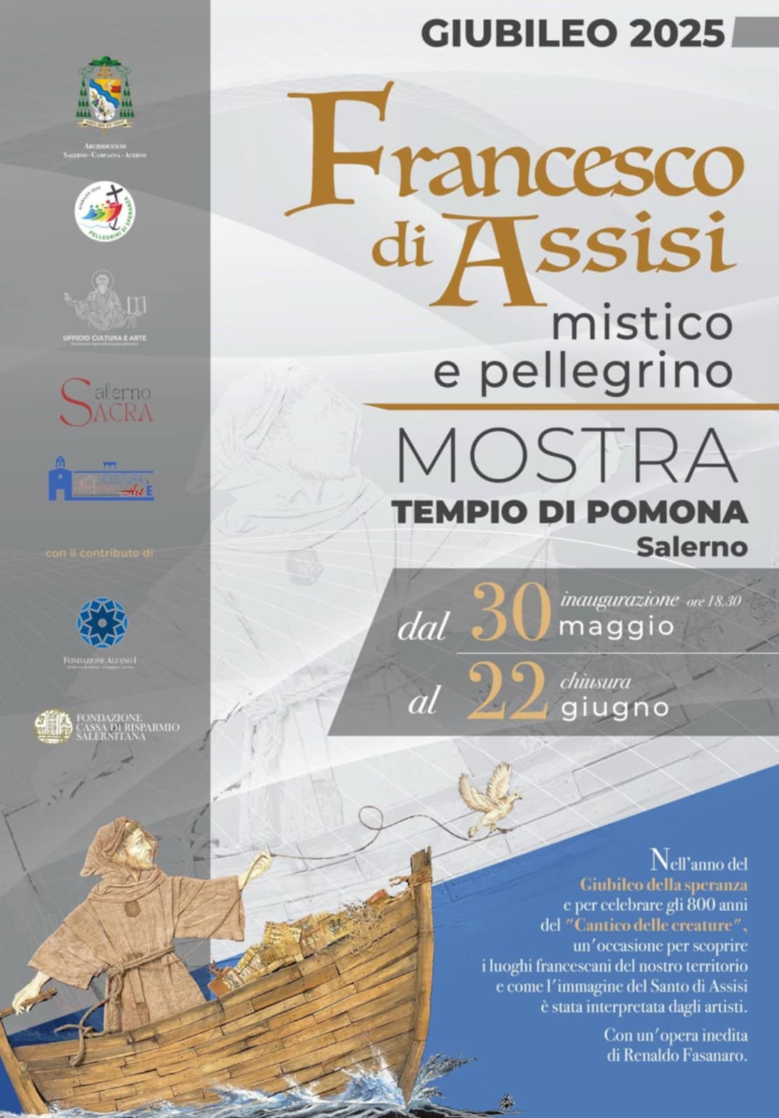 Al via, il 30 maggio 2025, presso il Tempio di Pomona di Salerno, la mostra artistica dedicata a San Francesco di Assisi, in occasione dell’ottavo centenario del suo Cantico delle creature (1225-2025). Il taglio del nastro dell’evento, proposto dall’Arcidiocesi di Salerno-Campagna-Acerno quale attività culturale legata al Giubileo 2025, è in programma, dunque, alle ore 18:30 di venerdì 30 maggio. “L’anno giubilare vissuto dalla nostra Arcidiocesi si arricchisce di un altro tassello significativo, questa volta attraverso una mostra dedicata a Francesco di Assisi, mistico e pellegrino. Infatti il giubileo sulla speranza interseca le ricorrenze dell’ottavo centenario francescano, che dal 2023 fino al 2026 celebra le tappe fondamentali dell’esperienza del Santo di Assisi. – ha sottolineato l’Arcivescovo di Salerno-Campagna-Acerno, S.E. Monsignor Andrea Bellandi – La mostra, costituita da immagini fotografiche di alcune opere, presenti nei conventi francescani del nostro territorio, aventi a tema Francesco mistico e Pellegrino, oltre a valorizzare espressioni artistiche meno conosciute che fanno parte della nostra tradizione, pone al centro il tema del pellegrinaggio, dimensione significativa di ogni anno giubilare. Nella mostra è infine presente un’opera inedita di Renaldo Fasanaro, che raffigura, con un taglio moderno, il grande Santo quale pellegrino universale”, ha concluso S.E. Monsignor Bellandi.