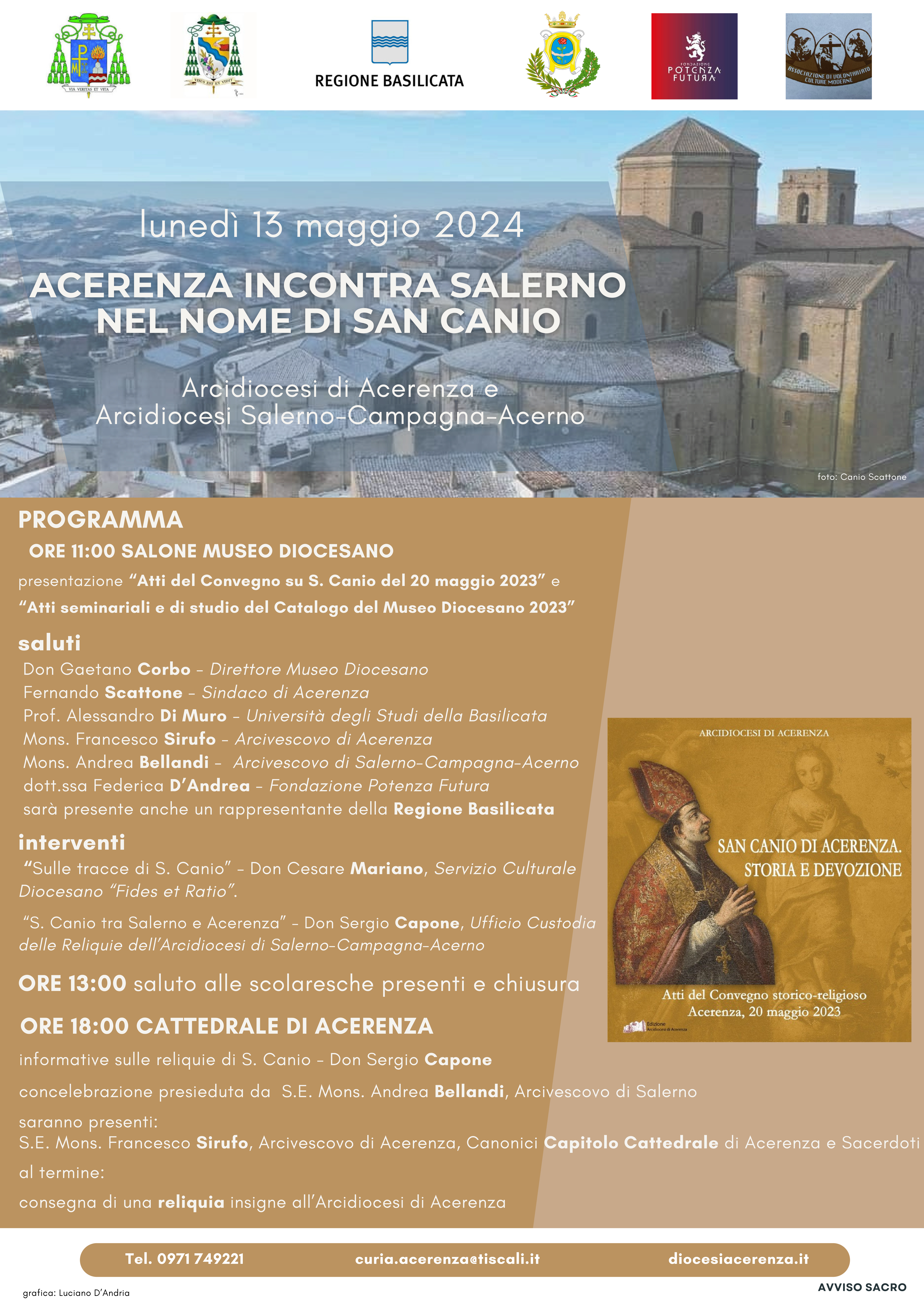 Al termine del convegno storico-religioso tenuto sia ad Acerenza il 20 maggio 2023 su San Canio e le sue reliquie, con un’attenzione particolare al rapporto tra Salerno ed Acerenza nell’XI secolo, in occasione della dedicazione della cattedrale di Acerenza il 13 maggio ci sarà la presentazione degli Atti e il solenne pontificale presieduto da Mons. Andrea Bellandi.