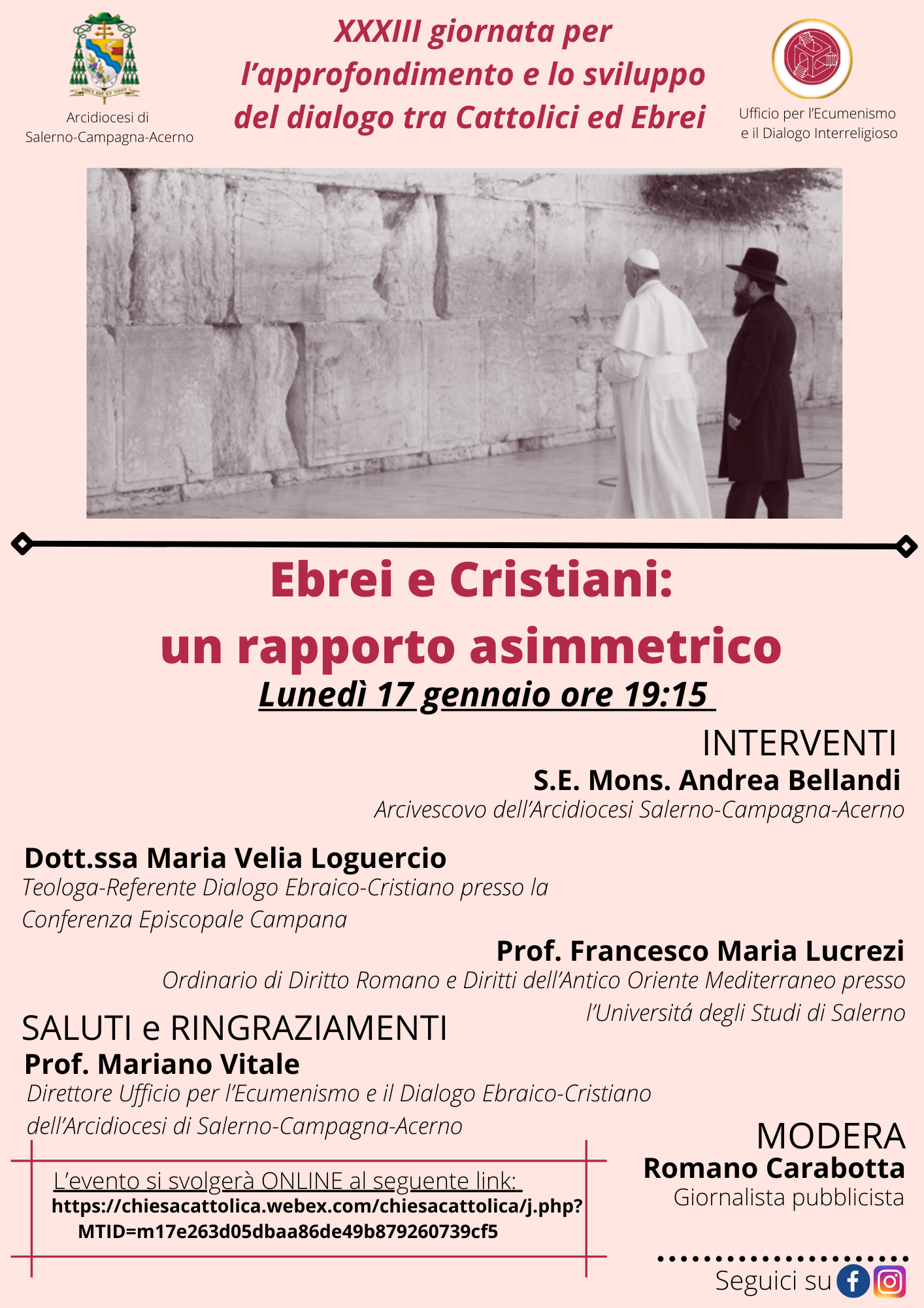 Lunedì 17 gennaio alle ore 19.15, in occasione della XXXIII Giornata per l’approfondimento e lo sviluppo del dialogo tra Cattolici ed Ebrei, l’Ufficio per l’Ecumenismo e il Dialogo interreligioso dell’Arcidiocesi di Salerno-Campagna-Acerno organizza un incontro sulla piattaforma Cisco Wevex sul tema “Ebrei e Cristiani: un rapporto asimmetrico”, durante il quale interverranno S.E. Mons. Andrea Bellandi, la Dottoressa Maria Velia Loguercio ed il Professor Francesco Maria Lucrezi, Ordinario presso l’Università di Salerno.