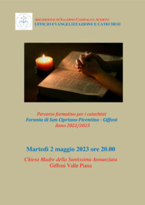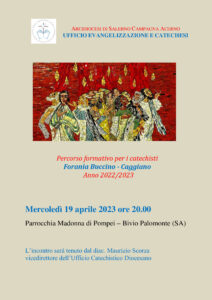 L’Ufficio Evangelizzazione e Catechesi ha organizzato i seguenti incontri di formazione in preparazione del Pellegrinaggio Catechistico Diocesano del 25 giugno p.v. con l’Arcivescovo presso la Collegiata di San Michele Arcangelo in Solofra.