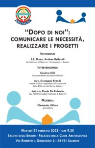Martedì 21 febbraio alle ore 9.30 nel Salone degli Stemmi del Palazzo Arcivescovile di Salerno, l’Unitalsi Salerno ha organizzato un momento di riflessione sul tema del “Dopo di noi”, per portare l’attenzione sulle esigenze delle persone con disabilità, esigenze che stanno cambiando profondamente. E a queste esigenze bisogna dare la risposta giusta, dal punto di vista giuridico, organizzativo e istituzionale.