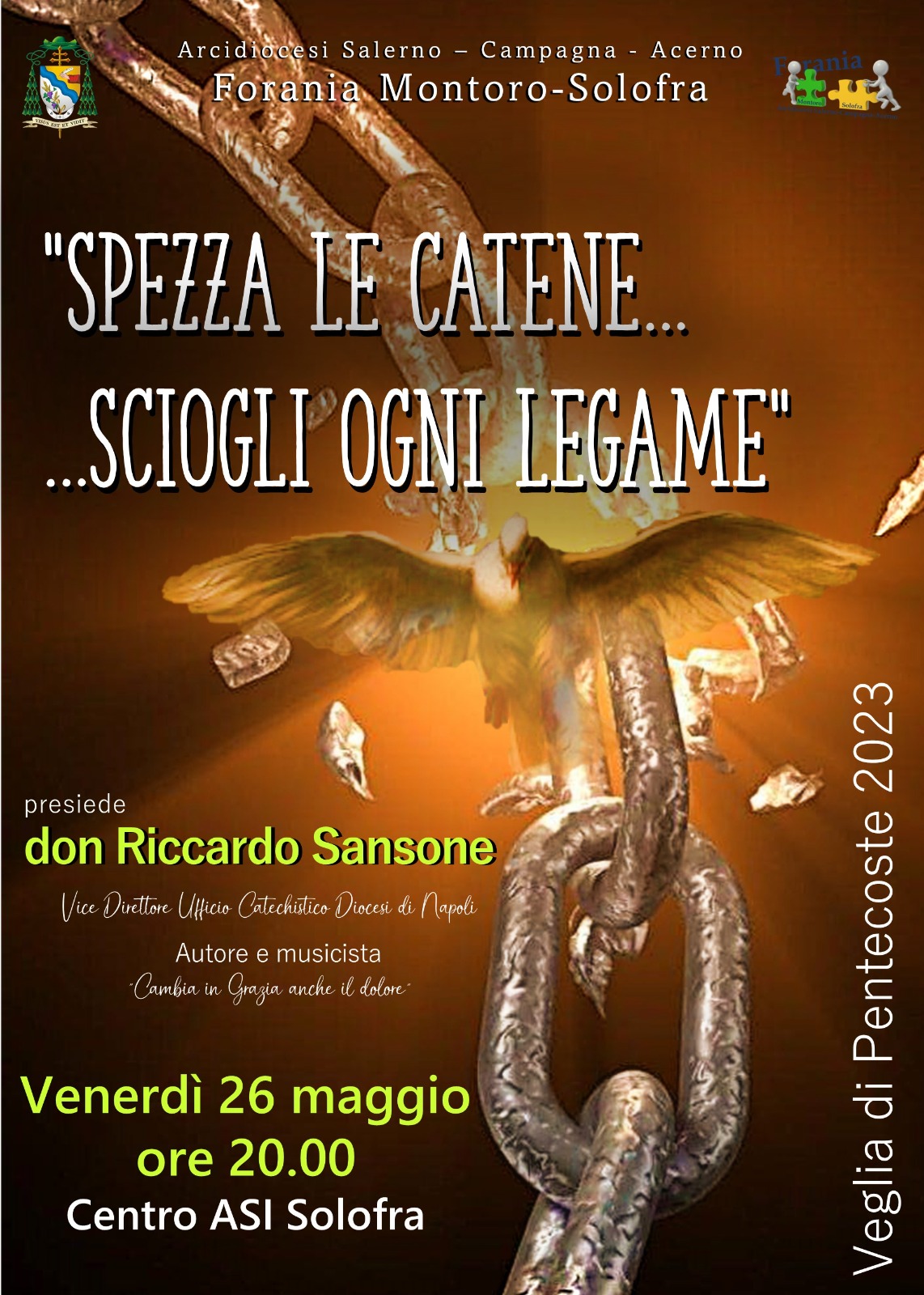Venerdì 26 maggio, alle ore 20.00, presso il Centro Asi di Solofra si tiene la veglia di Pentecoste dal titolo “Spezza le catene… sciogli ogni legame”. Un momento di preghiera e riflessione sullo Spirito Santo guidato da don Riccardo Sansone, Vice rettore Ufficio Catechistico di Napoli, autore e musicista “Cambia in Grazia anche il dolore”, organizzato dalla Forania di Montoro-Solofra.