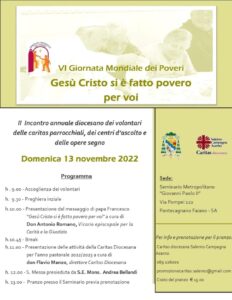 Domenica 13 novembre dalle ore 9.00 presso il Seminario Metropolitano “Giovanni Paolo II” di Pontecagnano Faiano si terrà un incontro in occasione della VI Giornata Mondiale dei Poveri che si concluderà con la celebrazione eucaristica presieduta da S.E. Mons. Andrea Bellandi.