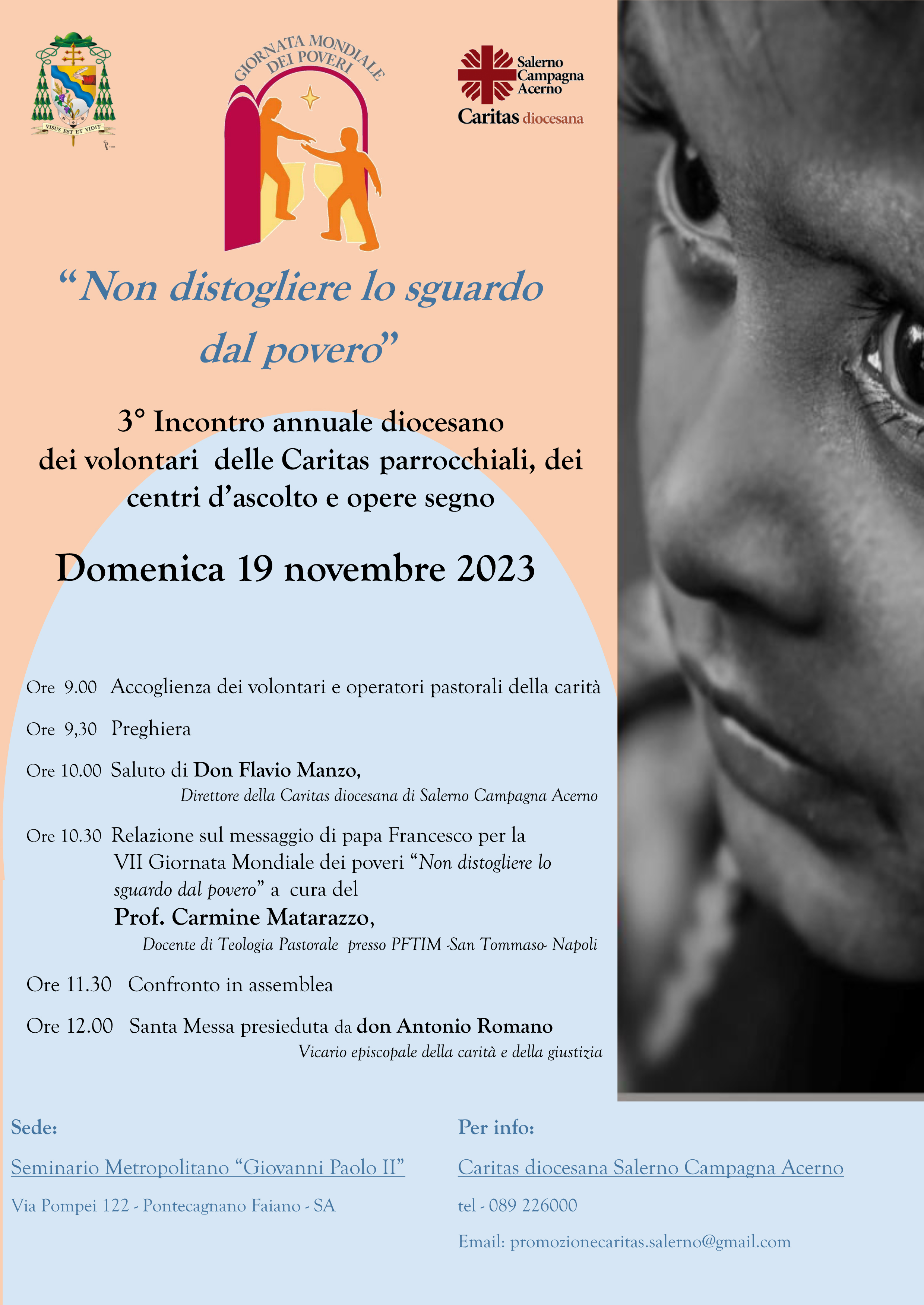 Domenica 19 novembre si terrà il III incontro annuale diocesano dei volontari delle Caritas parrocchiali, dei centri d’ascolto e opere segno presso il Seminario Metropolitano “Giovanni Paolo II”, relaziona il prof. Carmine Matarazzo, docente di teologia pastorale presso la Pontificia Facoltà dell’Italia meridionale sez. San Tommaso di Napoli, che durante il 43° Convegno Nazionale delle Caritas Diocesane, vissuto a Salerno lo scorso aprile, ha tracciato gli orientamenti finali per il cammino comune suggerendo che “Occorre cambiare lo sguardo. Nella logica della misericordia possiamo ipotizzare una progettualità capace di un cambio sistemico secondo il Vangelo… perché nessuna forma di miseria della persona umana è tanto grave da offuscare la sua dignità”.
