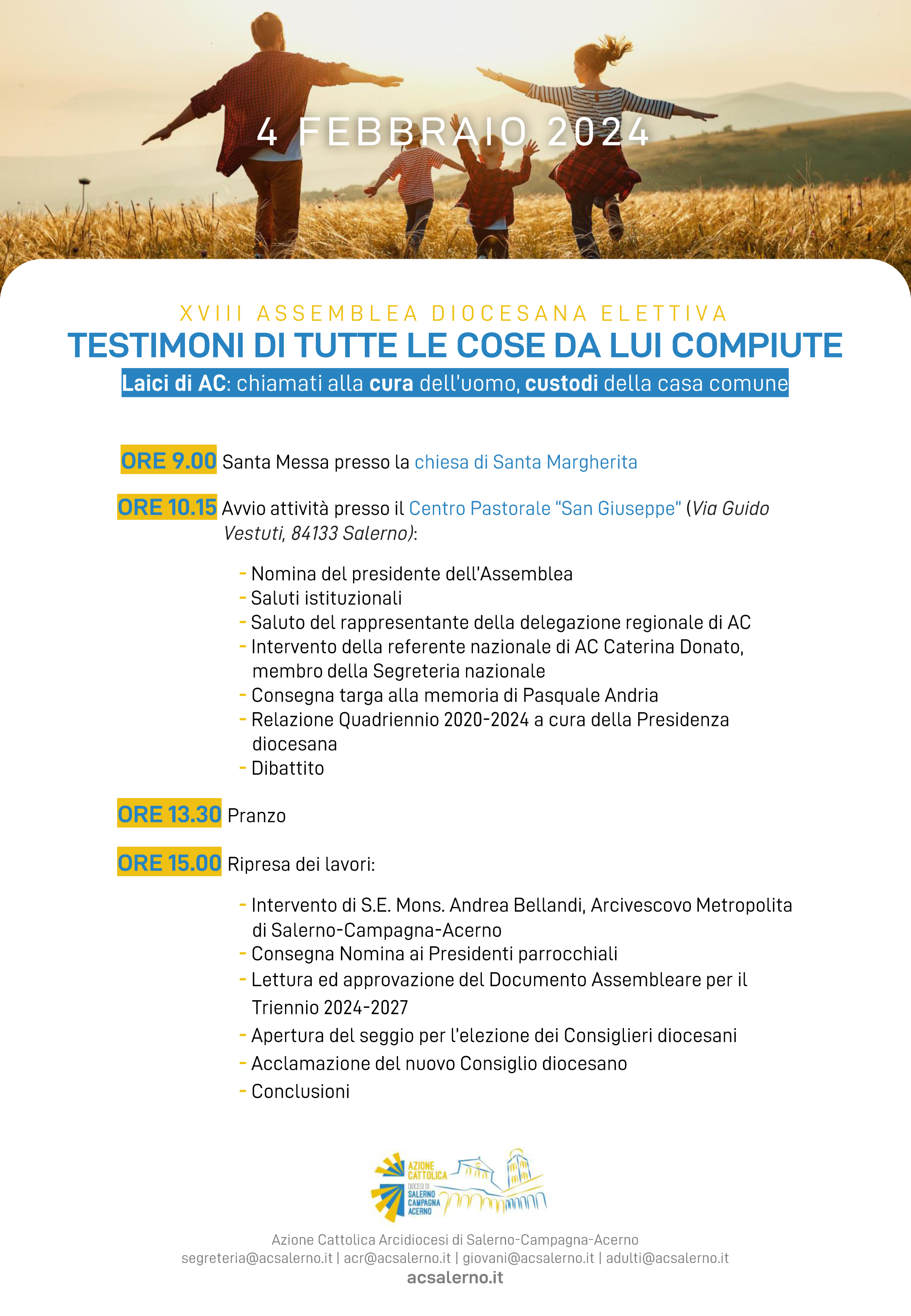 Domenica 4 febbraio 2024 si terrà, presso il Centro Pastorale “San Giuseppe” (Via Guido Vestuti, Salerno), la XVIII Assemblea Elettiva di Azione Cattolica dell’Arcidiocesi di Salerno-Campagna-Acerno.