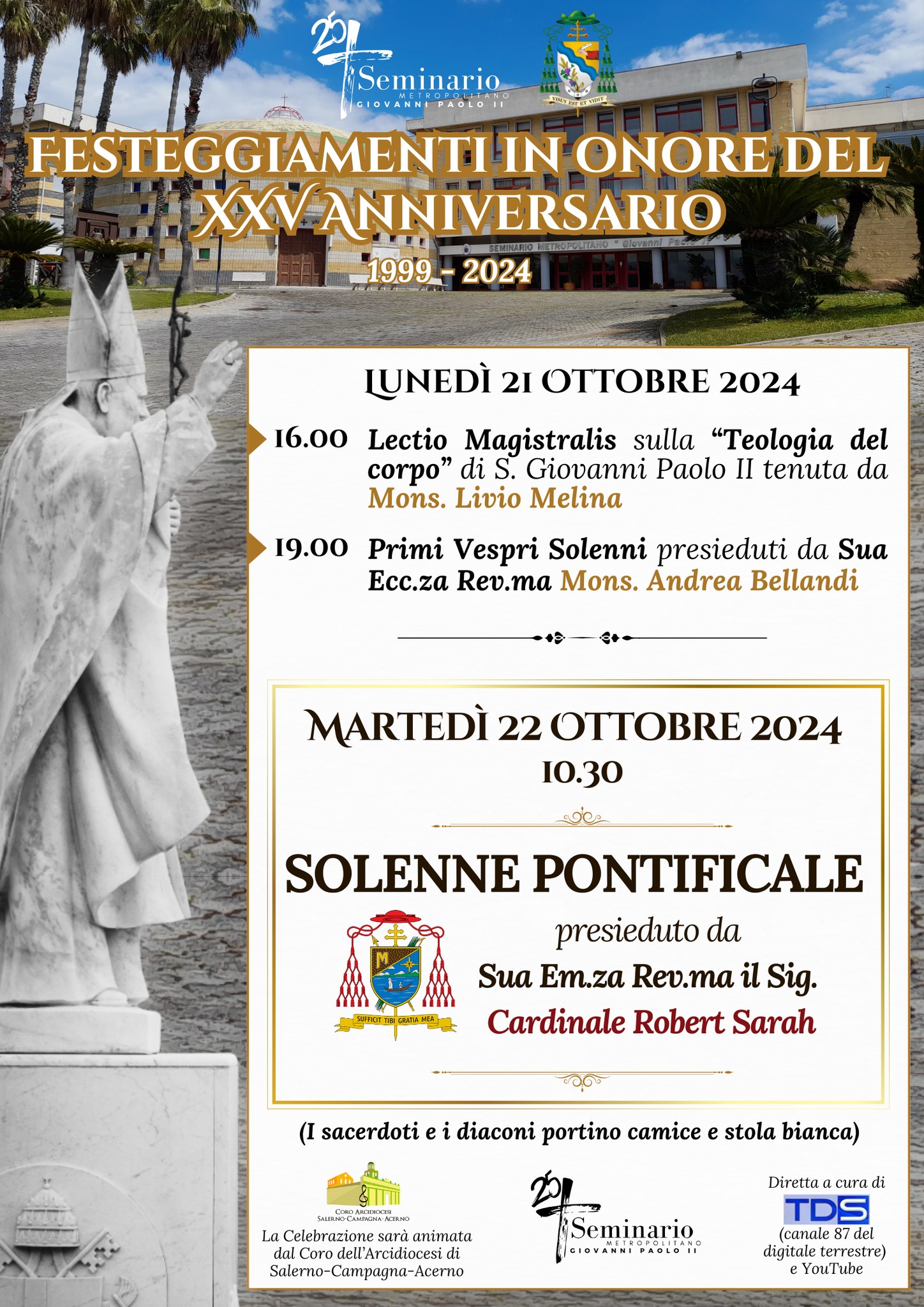 I festeggiamenti per il XXV del Seminario Metropolitano Giovanni Paolo II, inaugurati lo scorso 18 aprile, sono arrivati alla fase conclusiva. Lunedì 21 ottobre alle ore 16.00 si terrà la Lectio Magistralis sulla “Teologia del corpo” di San Giovanni Paolo II tenuta da Mons. Livio Melina e alle ore 19.00, i Primi Vespri saranno presieduti da S.E. Mons. Andrea Bellandi. Martedì 22 ottobre alle ore 10.30 S.E. Rev. Card. Robert Sarah presiederà il Solenne Pontificale con la diretta su TDS.