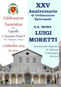 Il 12 settembre 2023 ricorre il XXV anniversario di Ministero Episcopale di Sua Eccellenza Monsignor Luigi Moretti, Arcivescovo Emerito di Salerno-Campagna-Acerno. Prevista per l’occasione, alle ore 19 di martedì, la Celebrazione Eucaristica nella Cappella San Giovanni Paolo II di via Vinciprova, a Salerno.